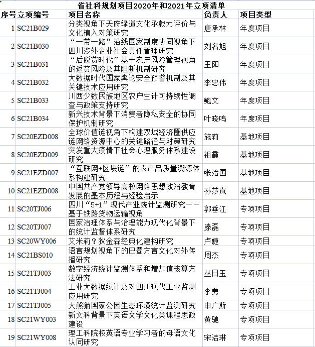 根据四川省社科联关于做好科研项目结题工作的通知,科技处拟对2020年和2021年立项的省哲学社会科学规划项目进行结题,包括年度项目、基地项目、后期资助、专项项目、科普项目和重大项目,现将有关事项通知如下: