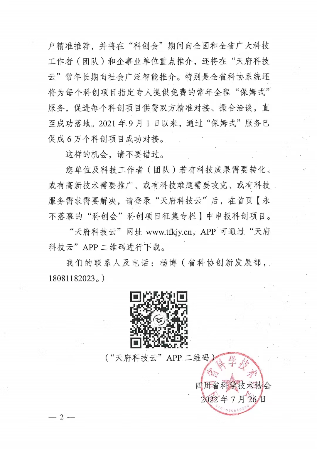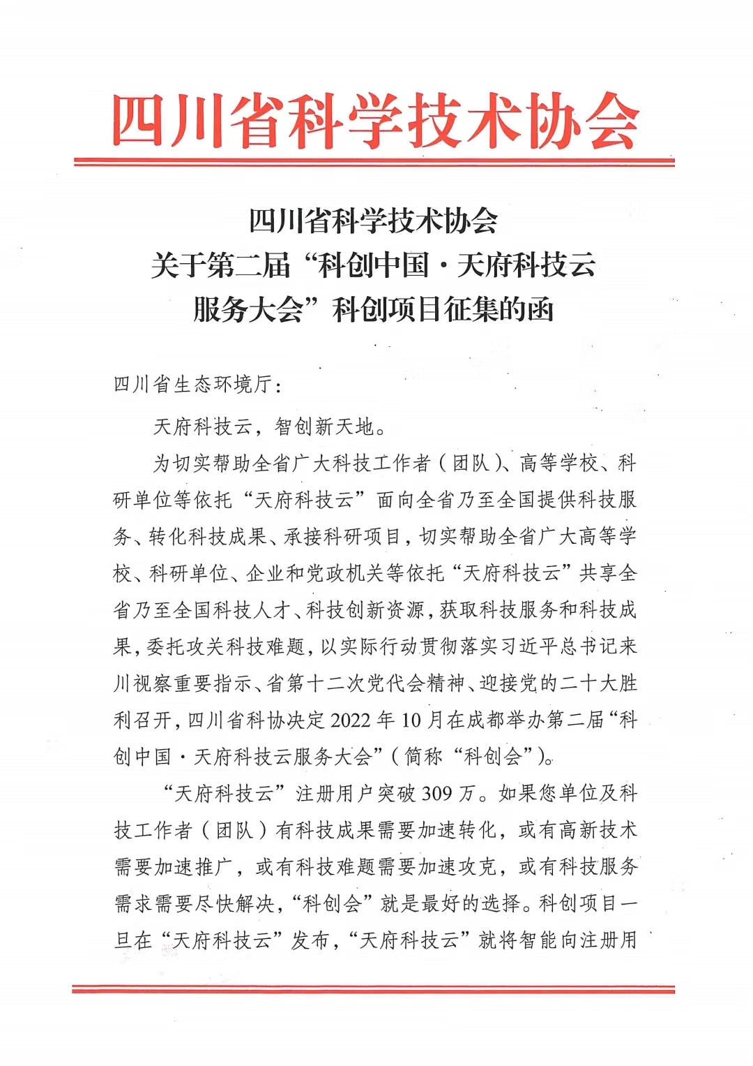 【通知】四川省科学技术协会关于第二届“科创中国·天府科技云服务大会”科创项目征集的函