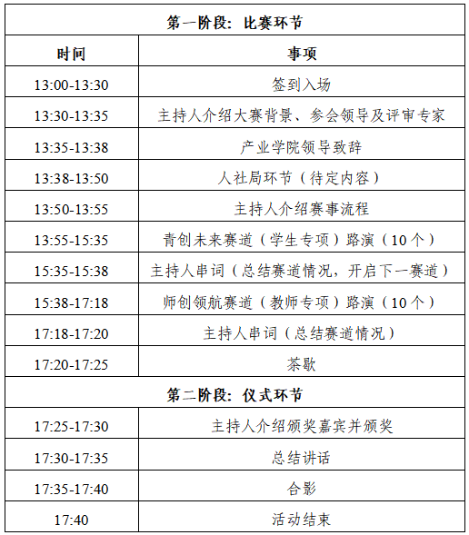 进入路演环节的项目按照6+4的形式进行路演(即6分钟ppt介绍+4分钟评委问答),项目应严格控制路演时间,比赛会设倒计时,一旦倒计时结束,主持人将强制打断。路演结束后,团队可与企业前往一对一洽谈区进行交流。