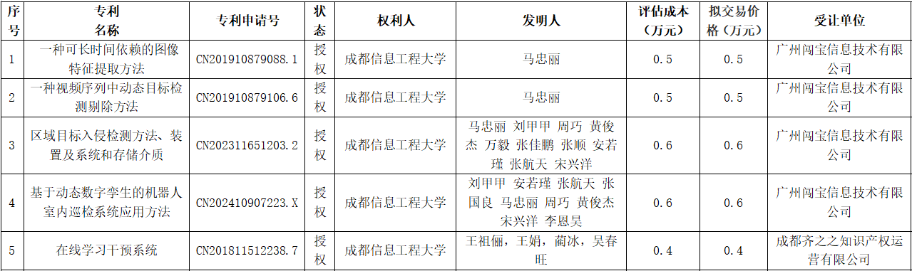 学校拟转让“一种可长时间依赖的图像特征提取方法”等五项专利权,现将有关事项公示如下: